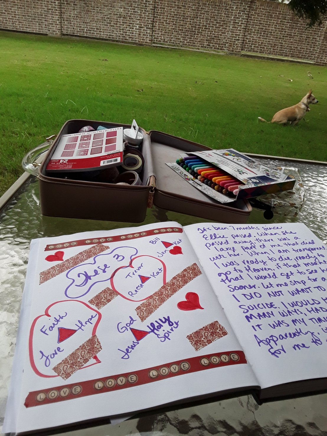 Sadie sits giving me company, Rusty too, and even my new friend Mr. spider, who keeps climbing around and around my patio chair.